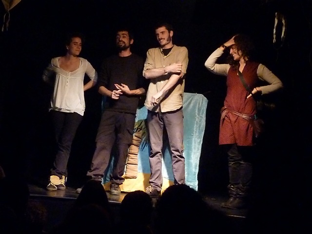 El cuarteto de Marionetas Nómadas en el escenario de la Casa-Taller de Marionetas de Pepe Otal, el día de sus despedida. De izquierda a derecha: Raquel Batet, Pere Bigas, Bruno Valls y Elena Molina.