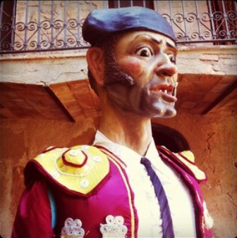 Por cierto, que Toni Mujal es el autor del único gigante torero de Cataluña, el interesante Figolete, creado en 1985 para una masía o casa de payés de Gargallà. Con una altura de 3,20 metros y un peso de 35 kilos, tiene la particularidad de que escupe agua por la boca. Según nos dice Wikipedia, en 2004 le cambiaron la ropa por un vestido rojo llamativo. Sería bueno que los barceloneses pudiéramos verlo de vez en cuando, aunque sea para compensar la sostenida abstinencia taurina a la que ha sido condenada la ciudad. He aquí una imagen del torero gigante pescada al vuelo de Internet en una búsqueda de Google.