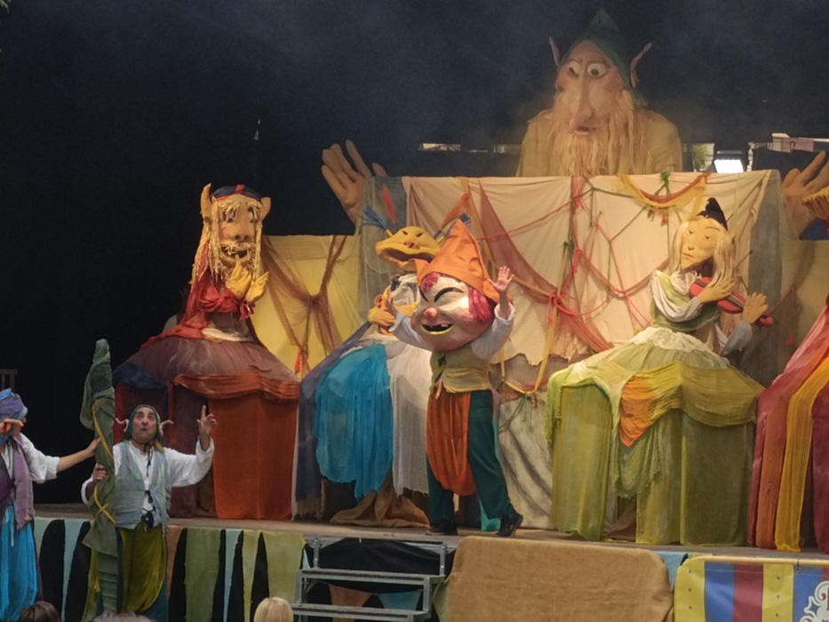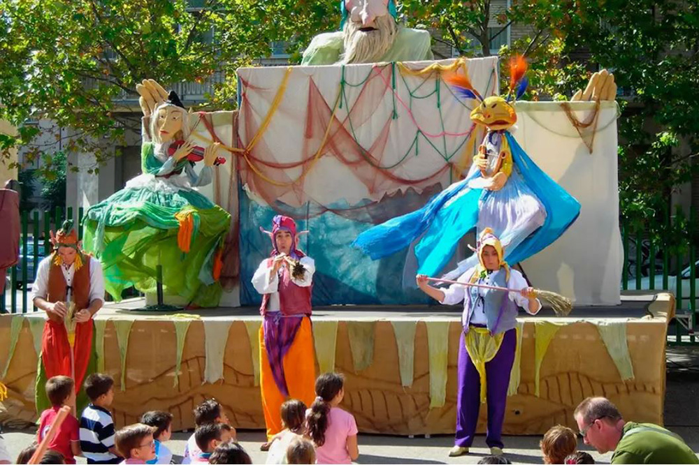 Nos encontramos con otra compañía aragonesa de larga experiencia también dedicada al teatro de calle y de animación, con la peculiaridad de recurrir a grandes muñecos para representar a unos personajes que centran la historia del espectáculo: los duendes.