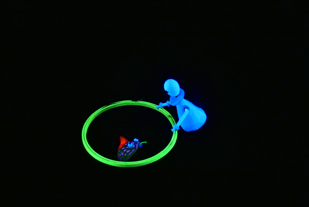Teatro, puro teatro, o puro circo galáctico, que juega con la luz negra, para romper todavía más sus ligámenes con la Tierra y la pesada gravedad que nos impide volar.