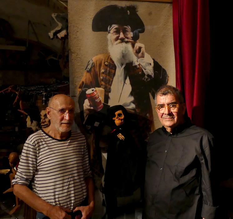 Pep Gómez, el titiritero que acompañaba a Pepe Otal en su último espectáculo, y Tonino Murro, frente a la imagen de Pepe en su atuendo marinero. Foto Jesús M. Atienza