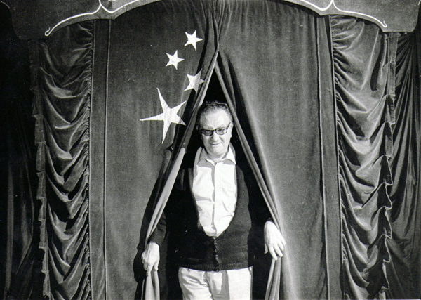 Joan Brossa sobre un escenari a la 2a Fira de Teatre de Tàrrega Format: digitalització fotografia blanc i negre. Foto Jaume Maymó. Arxiu Macba. Fuente aquí
