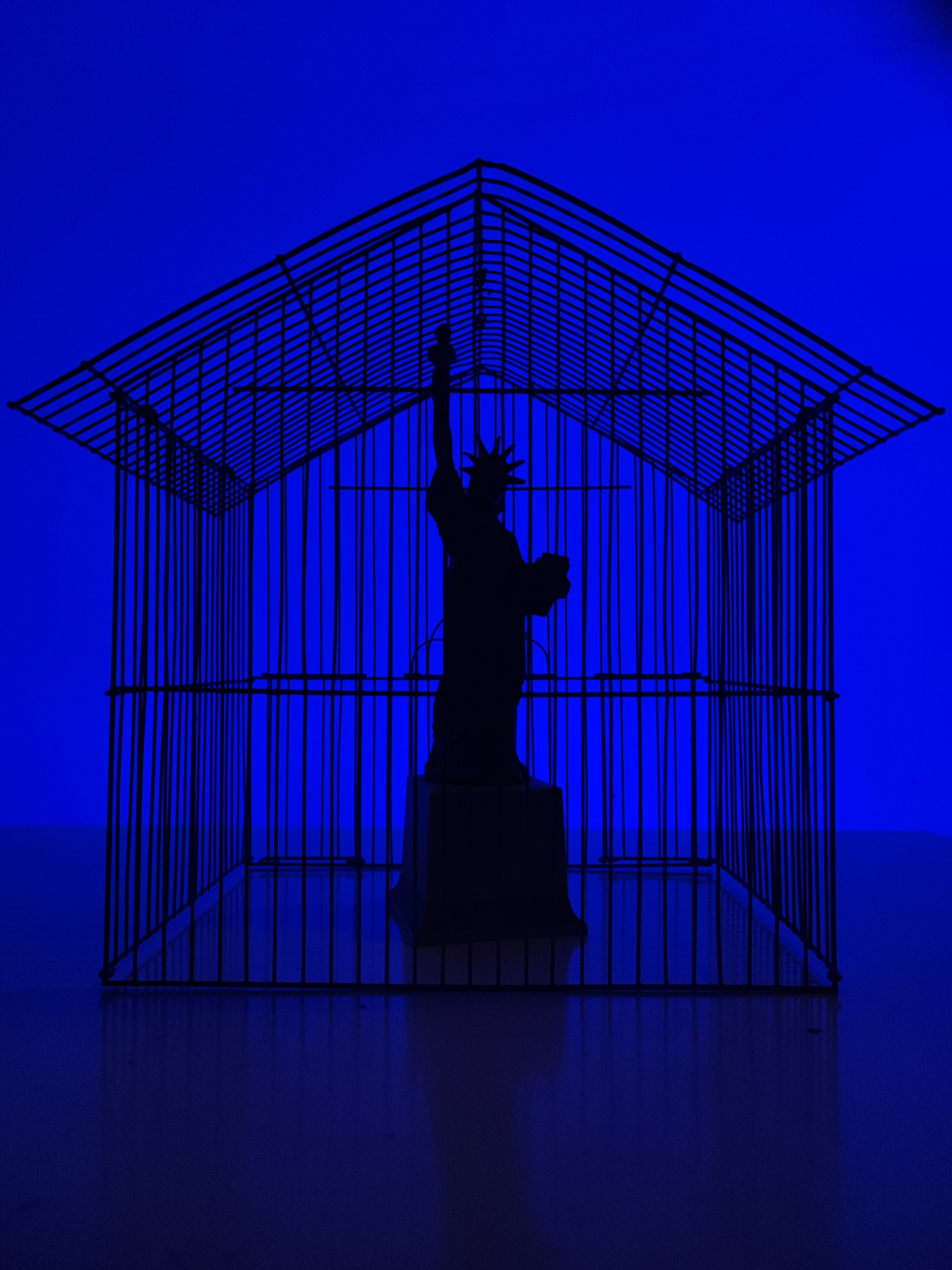 Tiempo Oscuro como lo define el título, aparentemente maligno como todo lo oscuro, pero que constituye también la salida de cualquier situación opresiva, pues pocos tiranos resisten el paso del tiempo. El Tiempo, simbolizado por un reloj de arena, no se detiene nunca, pero este reloj, necesita la mano que le dé la vuelta. Quizás al meterlo en una jaula, se busca detenerlo para siempre, sin que nadie le dé la vuelta, como hace con la estatuya de la Libertad. Vanas esperanzas, pues los relojes no son el Tiempo, capaz este de escaparse de cualquier jaula, y aun más de la solidez de una estatua.