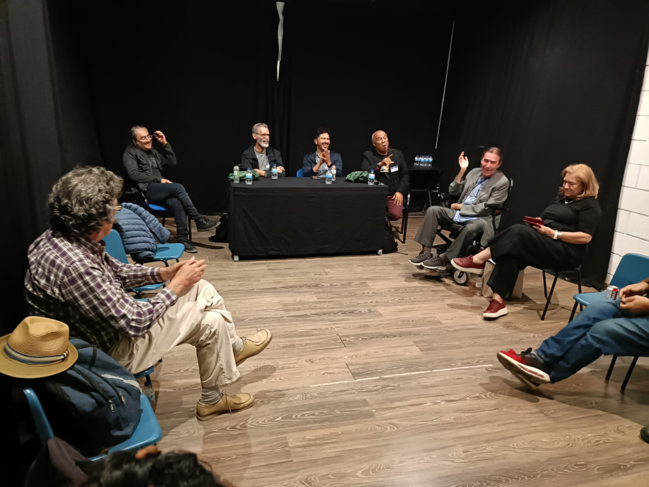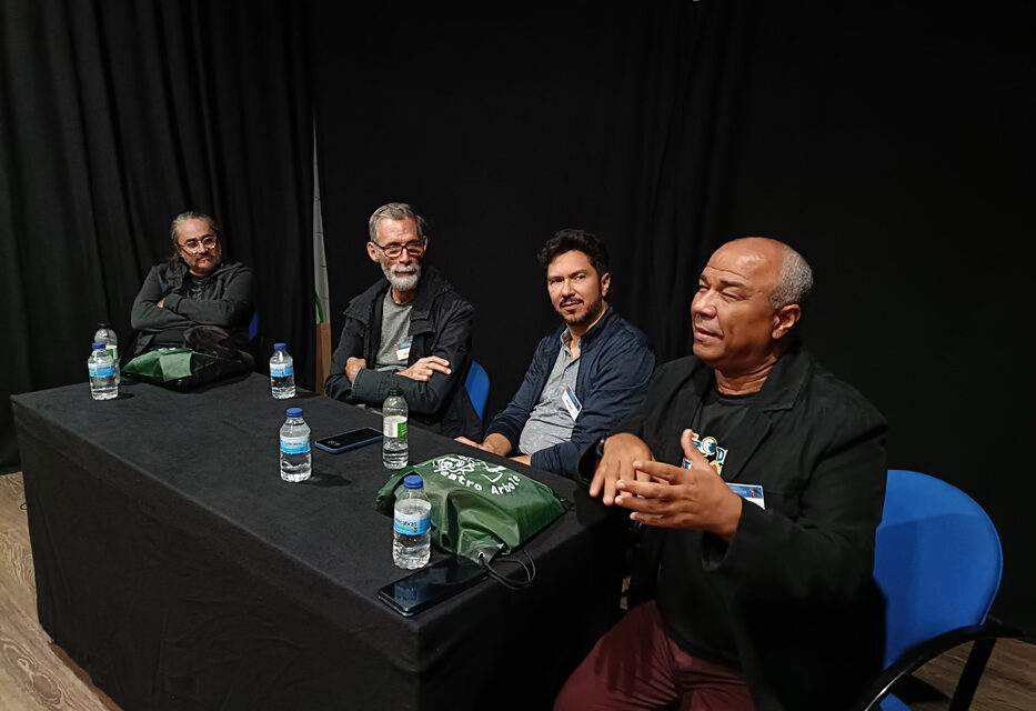 Los cuatro invitados internacionales de RITTO de 2024 en el encuentro con los titiriteros de Aragón en el Teatro Arbolé. De izquierda a derecha: Miguel Ángel Gutiérrez, de México; Zenen de Jesús Calero Medina, de Cuba; Manuel Moran de Nueva York, USA; y Rubén Darío Salazar, de Cuba. Foto T.R.