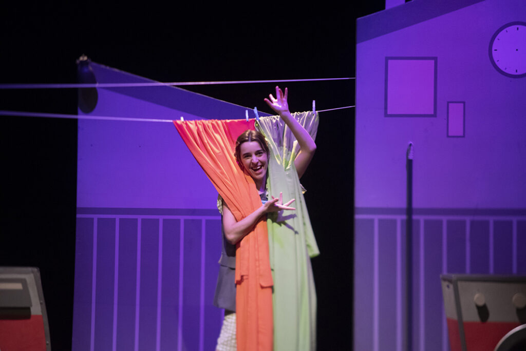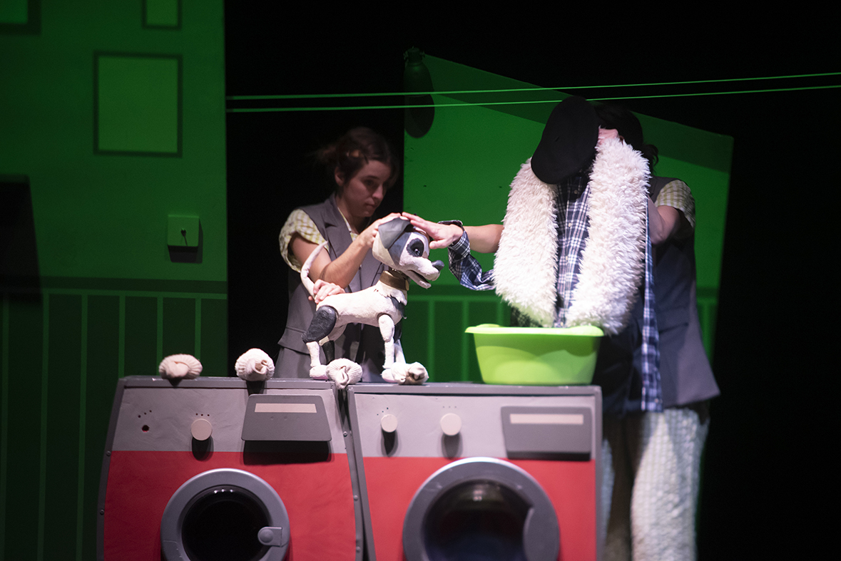 Con estos bagajes se entiende que una obra como Pinto Pinto, basada en una canción y en la figura de un perro alegre, travieso y sentimental, fluya como agua fresca en manos de las dos actrices. Pues así es cómo lo recibimos los espectadores: un flujo de energías teatrales corriendo por el escenario entre ropas colgadas, máquinas de lavar, ventanas iluminadas y utensilios varios de los que se usan en las lavanderías. Dos personajes actuando en un registro indirecto de clown, sin palabra alguna, salvo el perrito Pinto Pinto, que habla como una cotorra su jerigonza perruna hecha de simpáticos aullidos, y no pocos ladridos.
