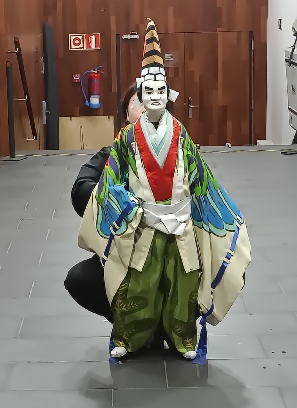 Fue una maravilla encontrarnos de pronto frente a una ceremonia de abertura de la sesión teatral de la noche, un ritual sagrado pero a la vez cotidiano del Japón, un tipo de representación que tanto nos sorprende a los públicos occidentales, acostumbrados a meter todo lo que huele a sagrado en iglesias y templos.