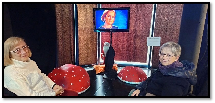 Adriana Cardone y Nati Cuevas, mientras al fondo aparece Rosana Torres la directora del programa “El carro de la farsa” de TVE por el que pasaron los mejores grupos de teatro. En esta ocasión se mostraba el reportaje que hizo con Luis y Adriana de La Gaviota. Foto de F. G.