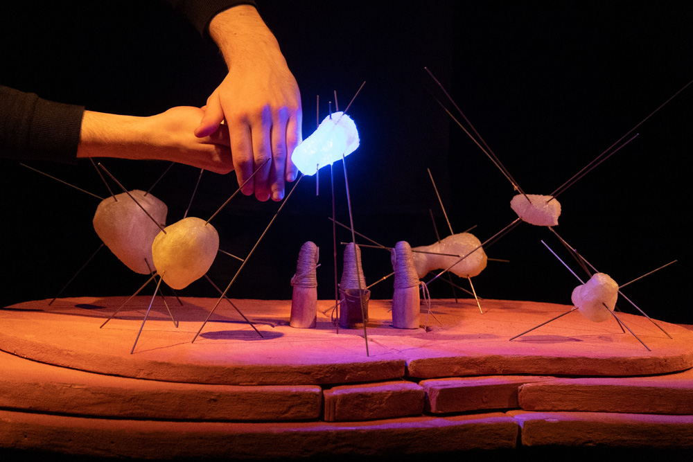 Entre los momentos más logrados, Plechovka, maják a ryba / La Lata, el Faro y el Pez de Alena Novotná: espectáculo sobre mesa, con figuras más pequeñas que la mano, arena manipulada con gran sensibilidad. Una barca/lata de sardinas flota sobre la arena. La tormenta se levanta, las olas secas suben, siempre más altas frente al frágil barco. El naufragio parece inevitable. Luego, la arena se convierte naturalmente en fondo marino, mientras la barca flota alto sobre las cabezas (suspendida en el invisible desván). Muy poético, de belleza frágil y potente. Esta mujer sin duda creará otros hermosos espectáculos: tiene sensibilidad en la punta de los dedos.