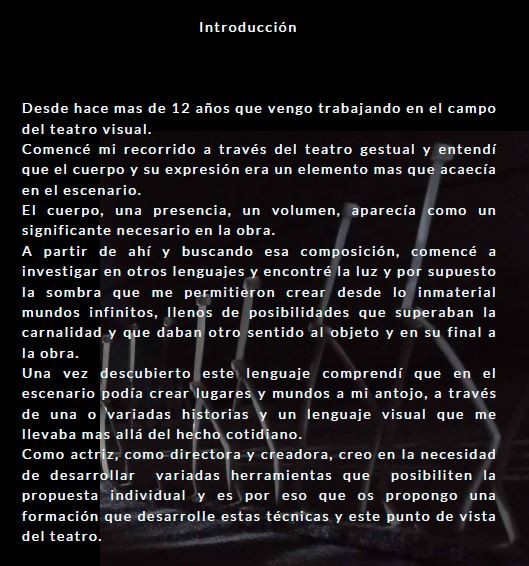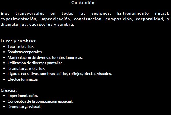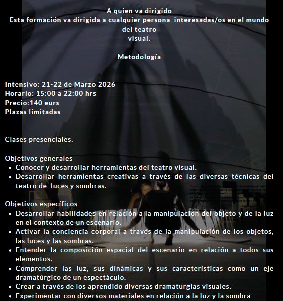 Está anunciado un interesante curso titulado ‘Teatro Visual, experimentando con las luces y las sombras’ a cargo de Javiera Gazitua, los días 21 y 22 de marzo de 2026 en el Centro Cultural La Bayka, en l’Hospitalet del LLobregat. Vean los detalles técnicos de la propuesta: