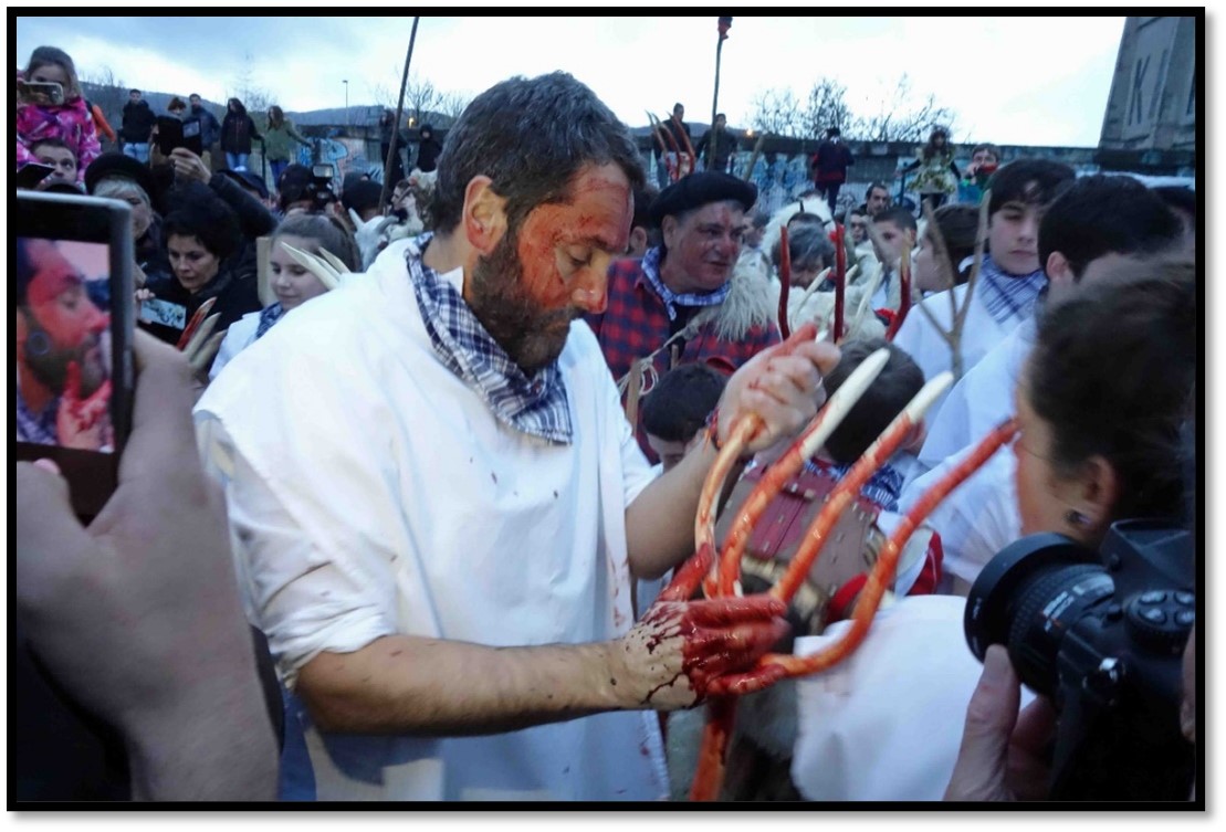 En ambos rituales los participantes se embadurnaban con sangre de animales recién sacrificados (en la actualidad con un tinte rojo similar) para luego perseguir y golpear con su sarda de madera, sobre todo a las mujeres, con el fin de provocar su fertilidad. Lo cierto es que este carnaval dejó de celebrarse antes de las prohibiciones del franquismo por lo agresivo y violento que resultaba, ya que se dice que las máscaras llegaban a entrar en los domicilios particulares.