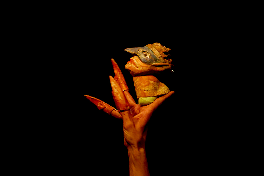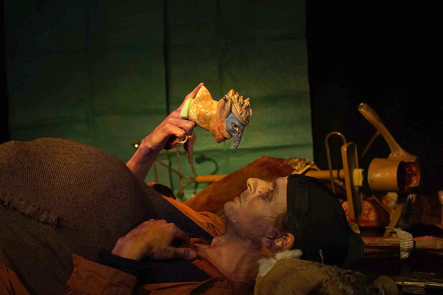 Hay un interesante cruce entre un teatro de la crueldad, que busca los lados más terribles, feos y terminales de nuestra existencia, y un teatro filosófico que no se resigna al abandono en lo aciago y fatídico, sino que lucha por mantener la clarividencia del loco que sabe que está loco y que lo utiliza para hurgar en sus verdades más ocultas, desdoblándose en sus personajes. Y para ello, los títeres son un medio ideal: permite al bufón salir de sí mismo y verse desde los otros que van surgiendo de este teatro de los desguaces. Un escenario repleto de deshechos que el personaje usa para armar sus alteridades titiretiles: máscaras, muñecos grandes de caras desfiguradas por los cartones recopilados, o títeres que surgen en sus manos de escondidas, dirigiéndose al titiritero bufón para accionarlo y darle en qué pensar y qué hacer.