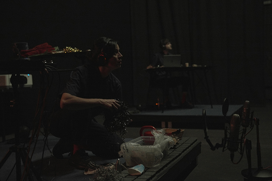Poca duda hay de que el cruce de lenguajes es hoy uno de los signos que mejor define el teatro contemporáneo en la vertiente del llamado Teatro Visual. Por otra parte, cine y teatro son dos mundos que se miran y se han mirado desde que nació el Séptimo Arte, por estrictas razones de parentesco, desarrollo y dependencia. Pero lo que ha hecho Macarena Recuerda en esta obra es algo de una radicalidad mayúscula, al transportar los entresijos del oficio cinematográfico en el escenario, no en su totalidad sino descuajando por entero su parte sonora, que vemos ejercida en directo siguiendo la temporalidad de una película de la que solo percibimos indirectos cambios lumínicos, estando la invisible pantalla como superpuesta entre el público y la escena.